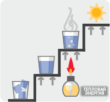 Разница между этими состояниями связана с их уровнями относительной энергии. При воздействии энергии в виде тепла на лед он тает и превращается в воду; дальнейшее нагревание приводит к испарению воды и образованию пара. Передача значительно большего количества энергии пару — нагрев его до температуры приблизительно 11 700 °C — приведет к разложению пара на некоторое количество составляющих его газов; при этом пар приобретет способность проводить электрический ток, то есть становится ионизированным. Такой ионизированный газ высокой температуры называется плазмой.